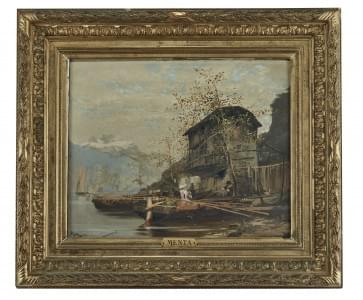 Barque animée au bord du lac, huile sur toile, signée et datée,...