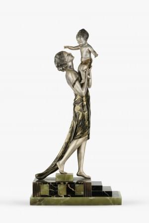 Dame à l'enfant, régule patiné et doré, marbre, signé, H 70 cm