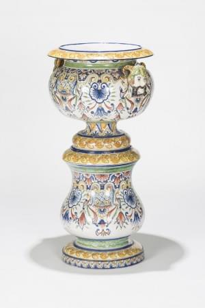 Faïence émaillée polychrome à décor de mascarons et arabesques,...