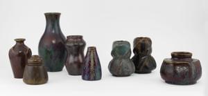 Paire de vases gourdes à festons torses d'époque Art nouveau, grès émaillé brun et bleu, les deux signés, H 18 et 17 cm. Provenance: couple d'amateurs en Suisse. Littérature: Adrien Dalpayrat, Céramique française de l'Art nouveau, Stuttgart, 1998, un modèle similaire reproduit p113, no 27