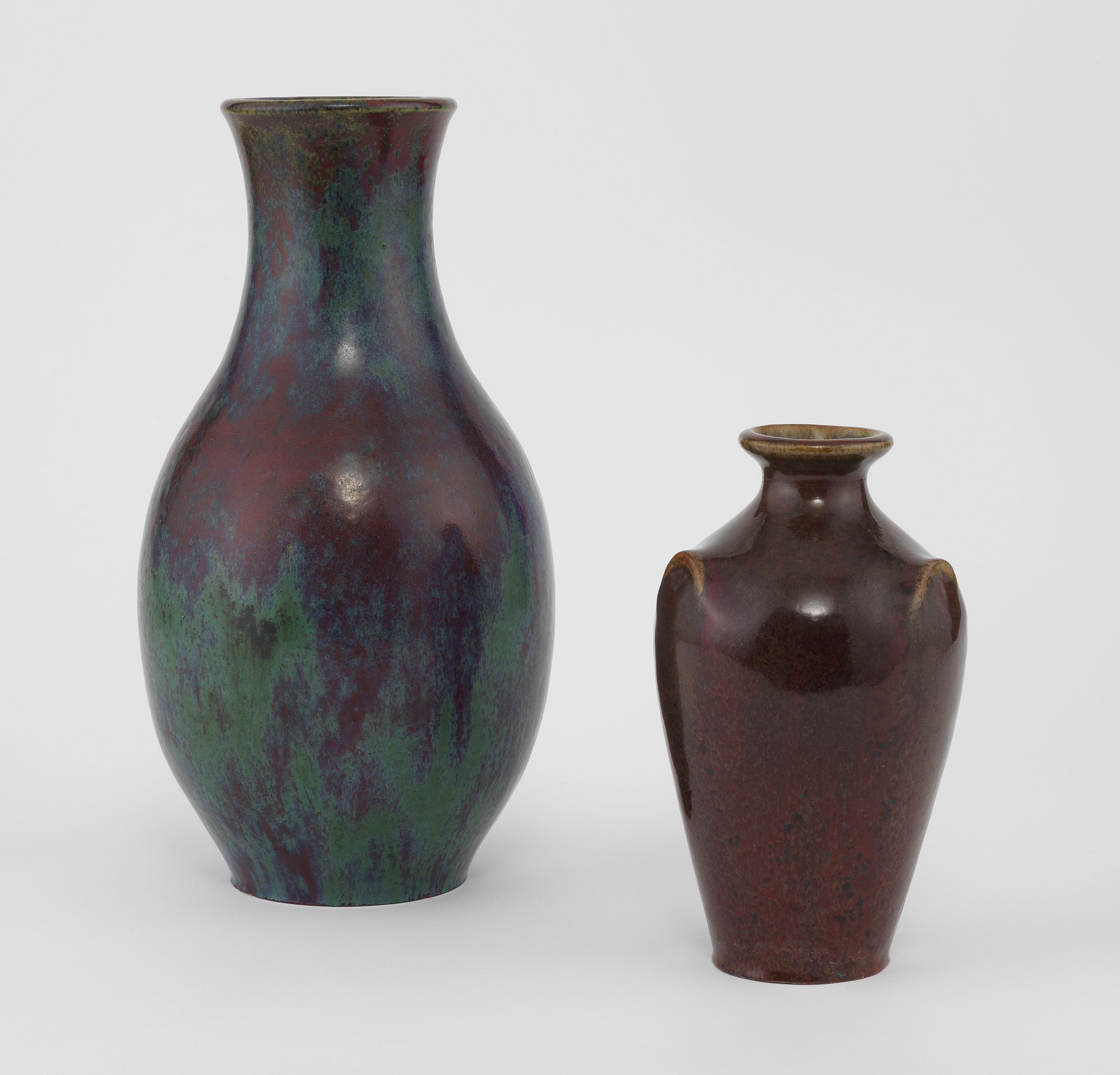 Deux vases d'époque Art nouveau, grès émaillé violet, bleu et brun, circa 1905, les deux signés et avec la marque à la grenade, l'un avec le no 2033 et l'autre 520, H 18,5 et 30 cm. Provenance: couple d'amateurs en Suisse