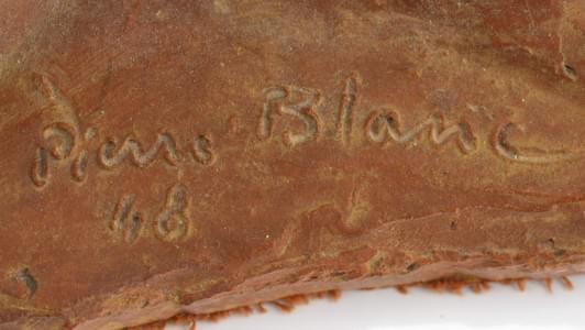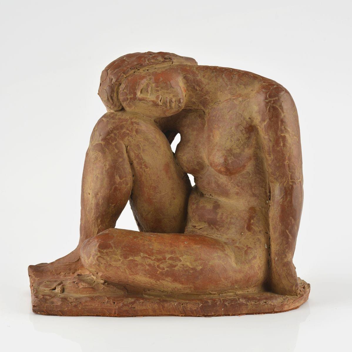 Femme nue allongée, terre cuite ocre, signée, 21x39 cm