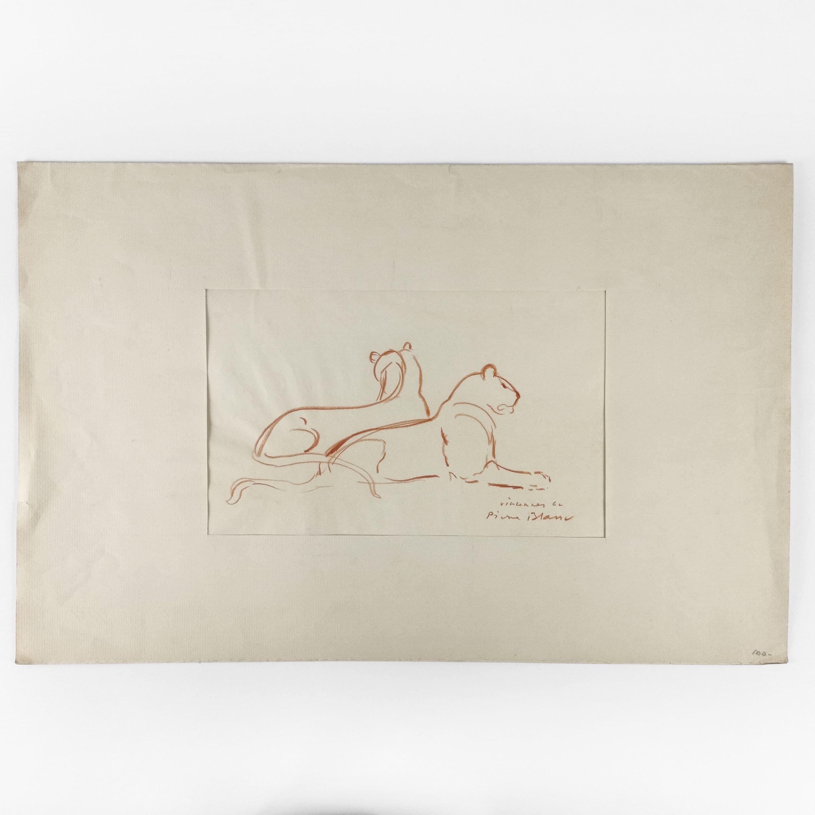 Lionnes au zoo de Vincennes, vers 1960, sanguine sur papier, signée, située et datée, 27x32 cm.