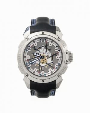 Cadran et lunette argentés, aiguilles luminescentes, chiffres arabes noirs, secondes avec fonction rétrograde en six secteurs de dix secondes, date à guichet à 6h, bracelet à boucle déployante en caoutchouc noir et liseré bleu, série limitée n°073/201, étanche à 100 m, acier, D 48 mm, avec certificat et écrin