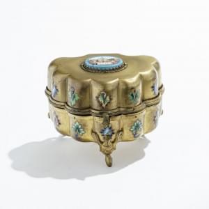 385. Coffret en forme de coquillage à décor émaillé de feuilles et or...