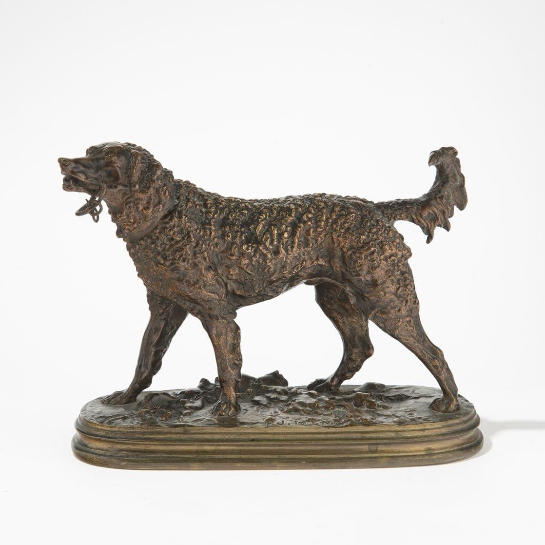Chien à la laisse, bronze à patine brune, signé, 20x27 cm