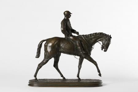 Jockey vainqueur du Derby, bronze à patine verte, signé, H 42 cm...