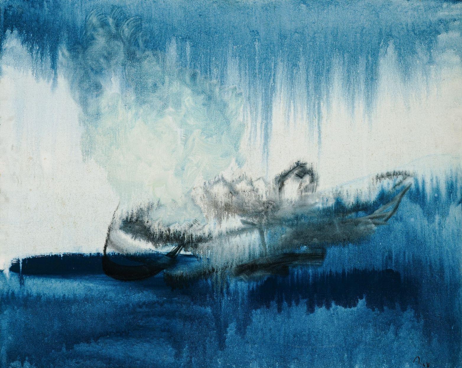 Paysage avec étang, bois gravé, signé, 15x21 cm