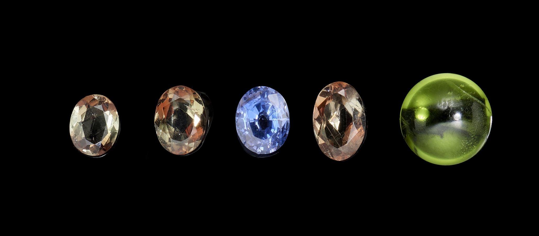 Dont un saphir taille ovale (1,8 ct), un péridot taille cabochon (6,7 ct), et trois andalousites taille ovale (total 4,2 ct)