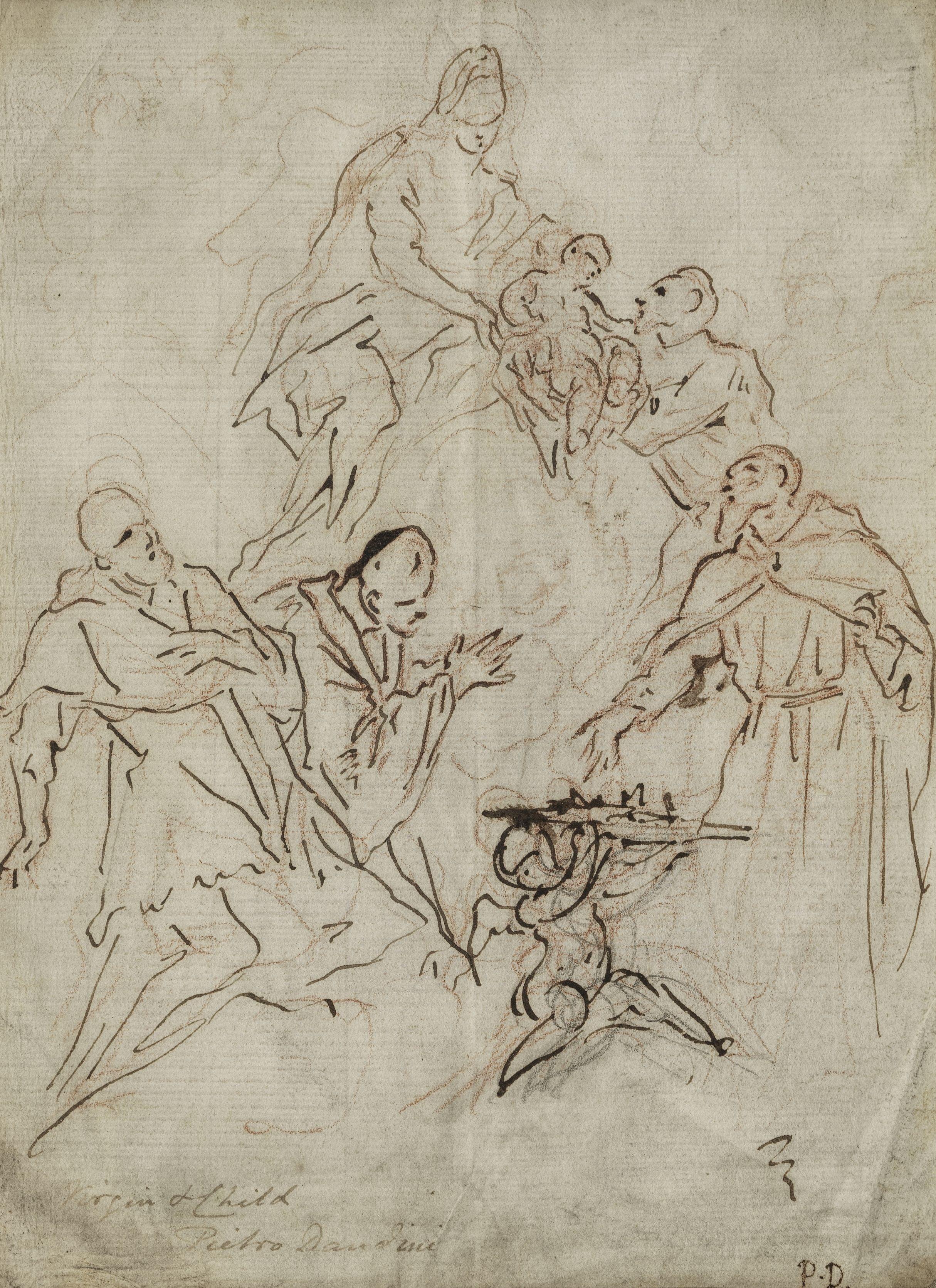 Etude pour la Vierge et l'Enfant parmi les saints, encre et sanguine sur papier, signé, 26x19 cm