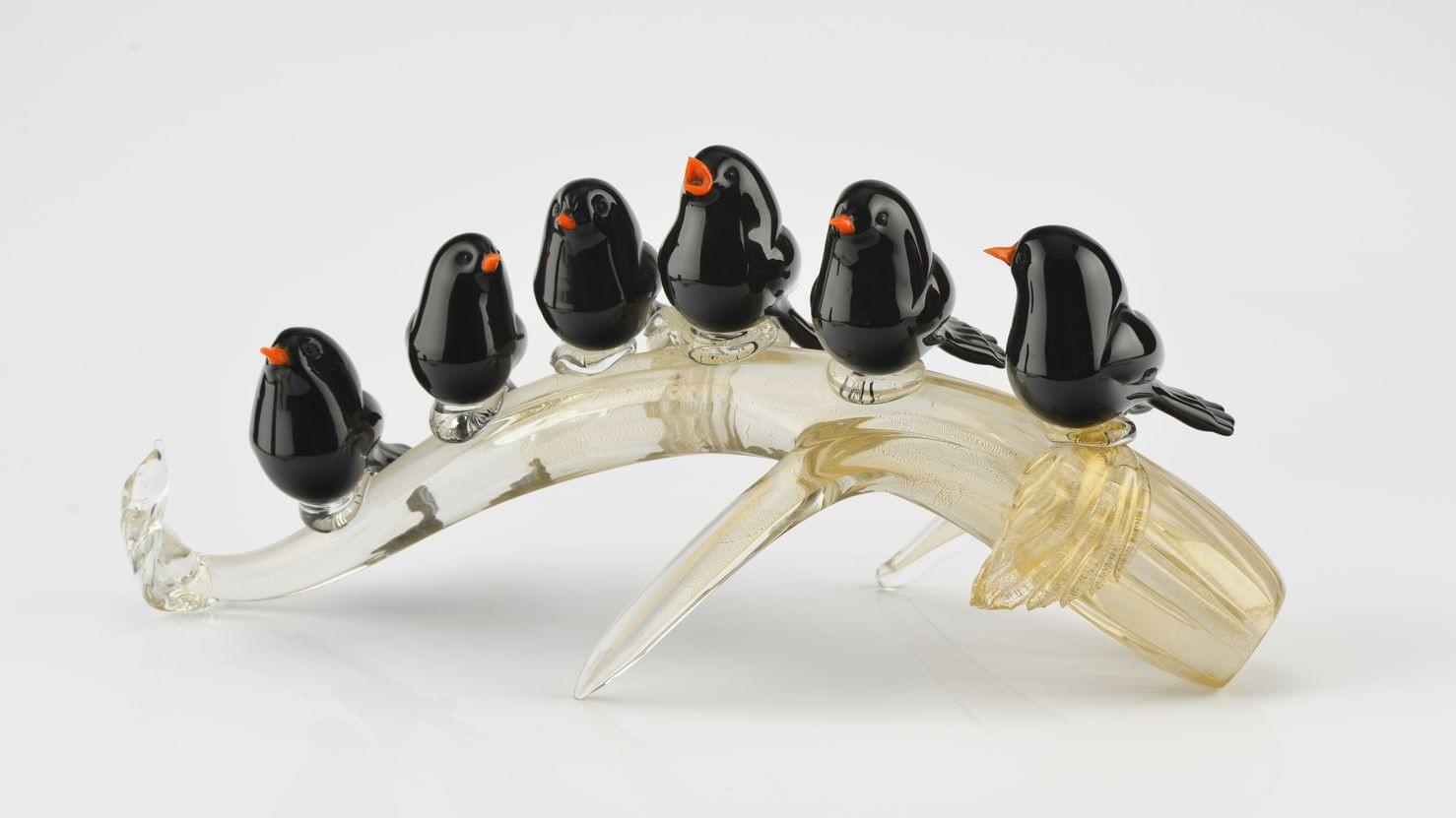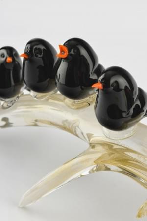 6 oiseaux sur une branche, groupe en verre polychrome soufflé,signé, L 40 cm