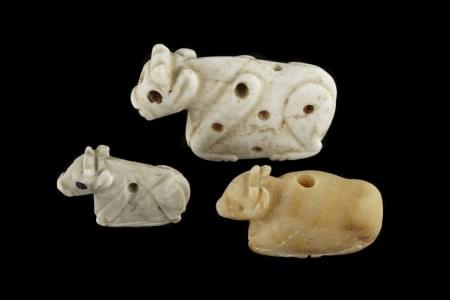 48. 3 amulettes figurant des bovidés au repos, calcite et marbre, Dj...