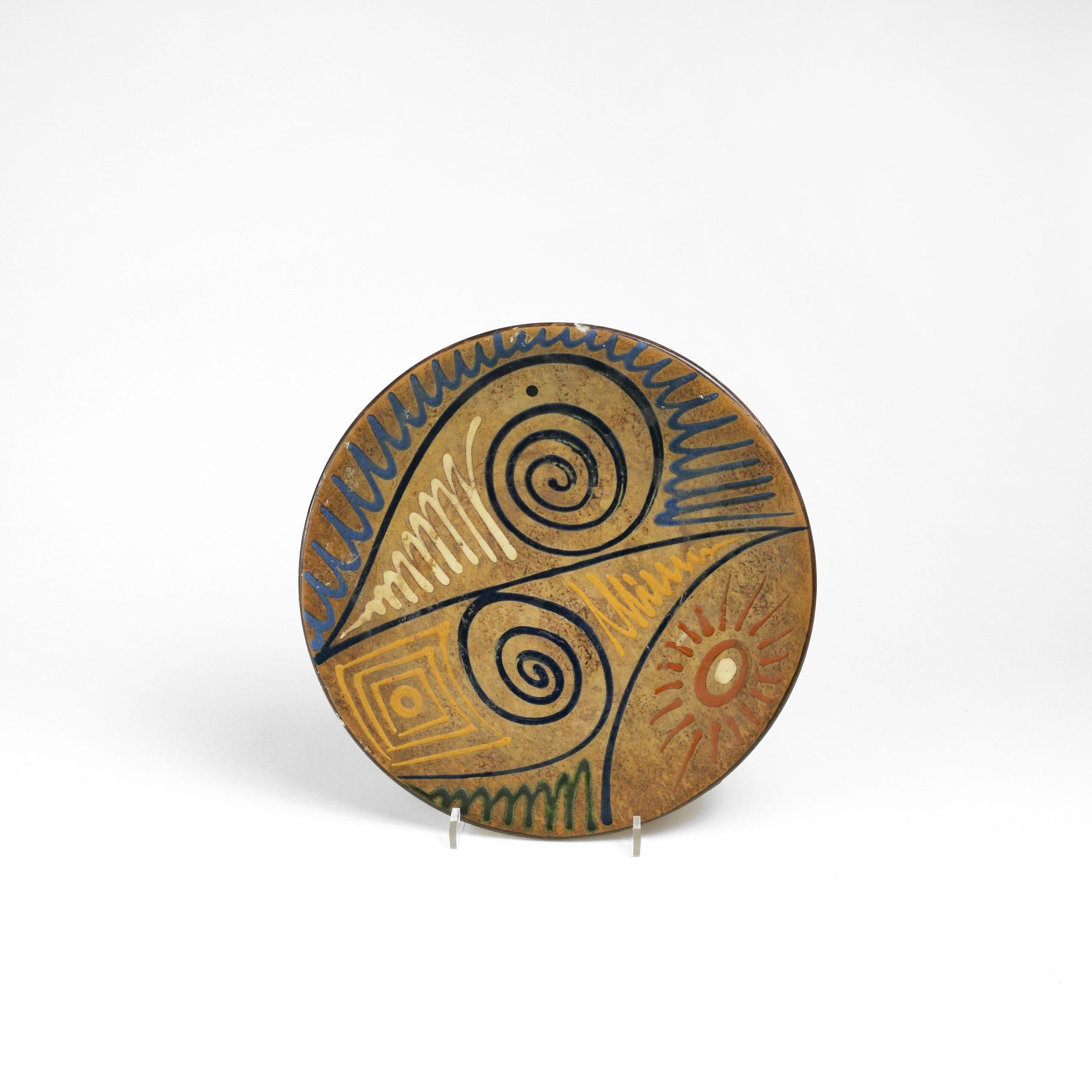 Céramique émaillée noir et vert à motif de visage, Sant-Vicens,...