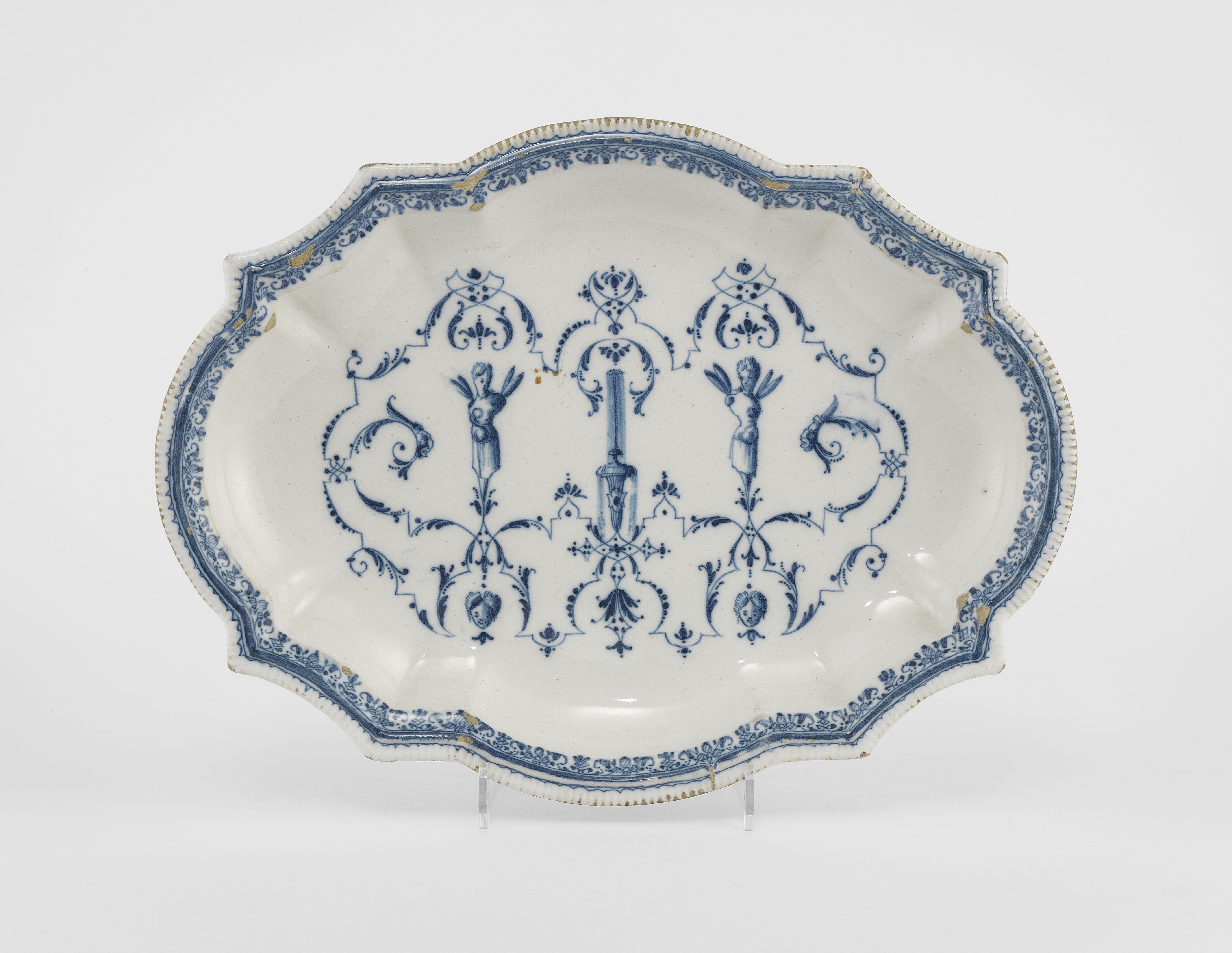 Faïence émaillée bleu blanc à décor à la Bérain, L 28,5 cm