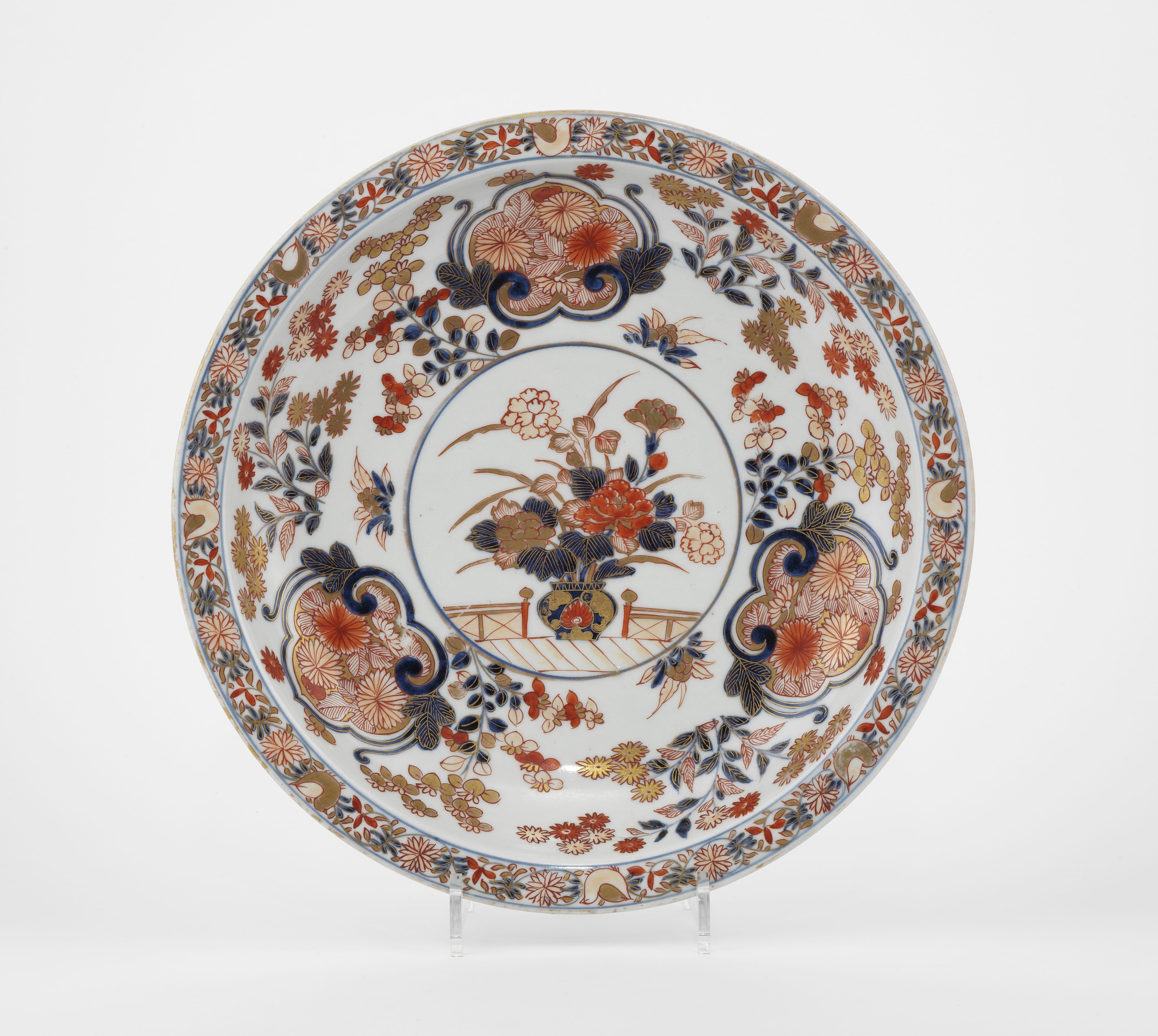 Porcelaine émaillée bleu rouge et or à décor de motifs floraux, D 34 cm