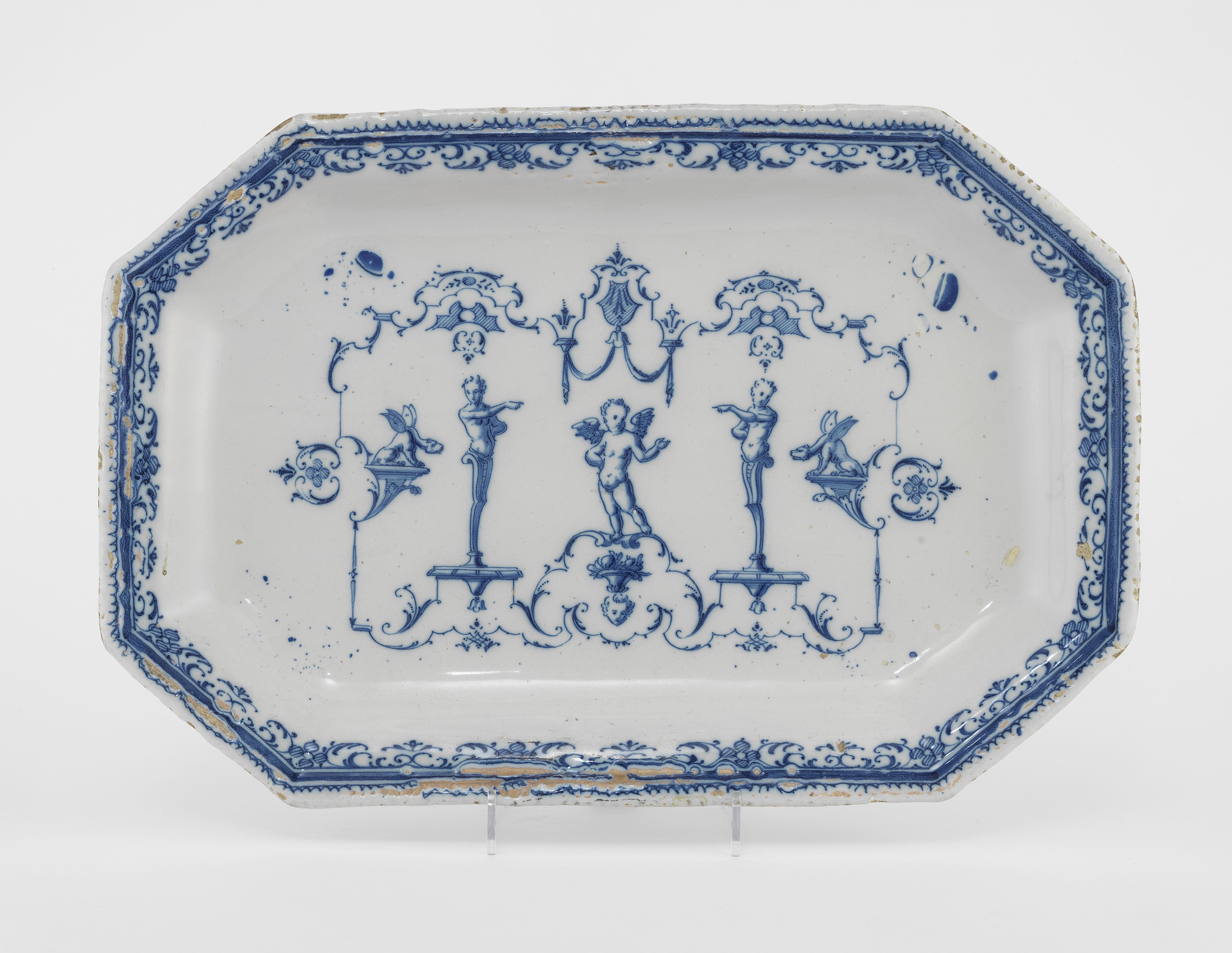 Faïence émaillée bleu blanc à décor à la Bérain, L 34 cm