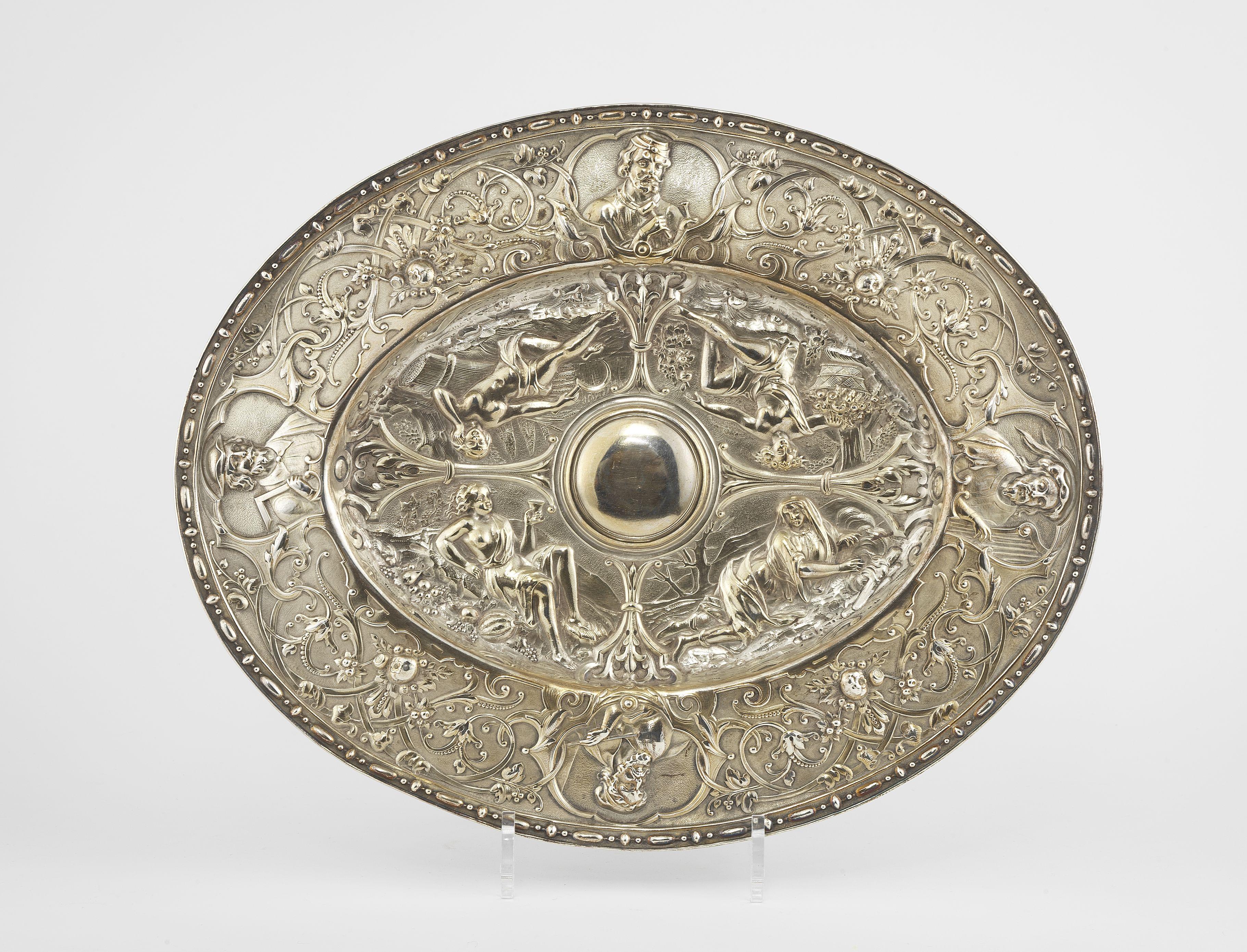 3781. Plat ovale à riche décor repoussé des allégories des quatre saisons et des arts