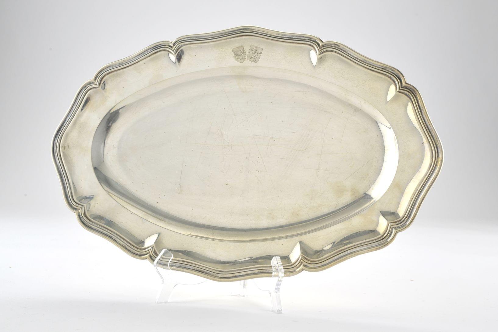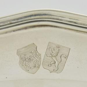 3189. Plat ovale festonné gravé d'armoiries d'alliance