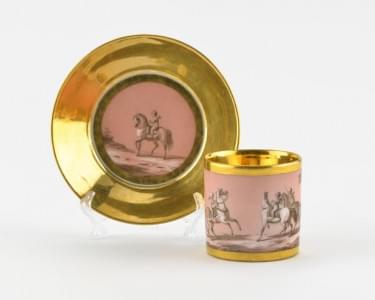 174. Tasse et sous-tasse à décor en camaïeu gris sur fond rose et or
