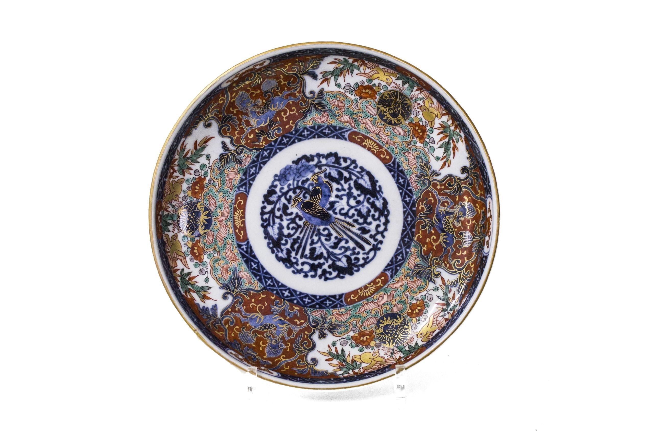 Porcelaine émaillée bleu, rouge, vert et or à motifs floraux et d'oiseaux, D 24 cm