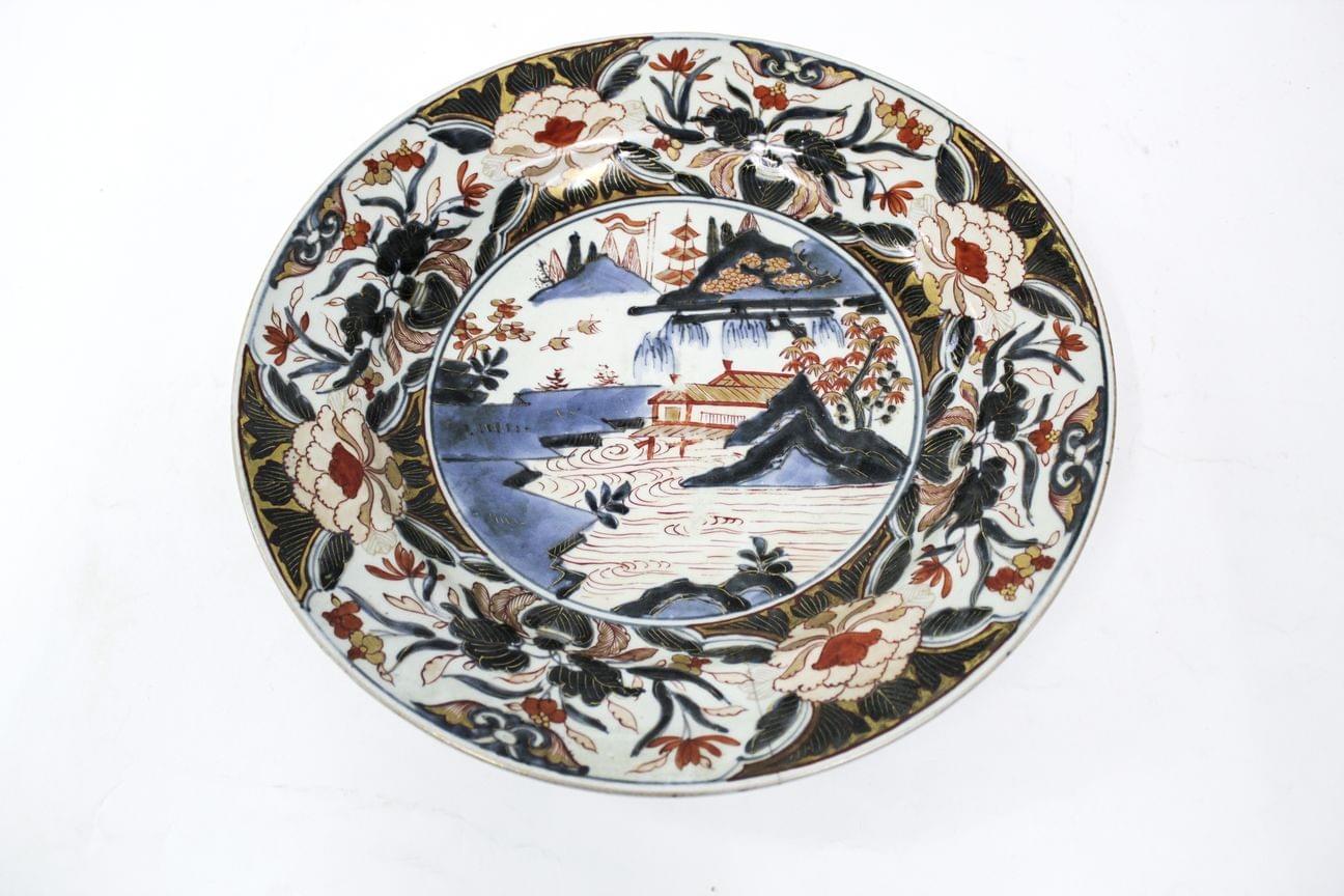 Porcelaine à décor bleu rouge et or de paysages et fleurs, D 36 cm
