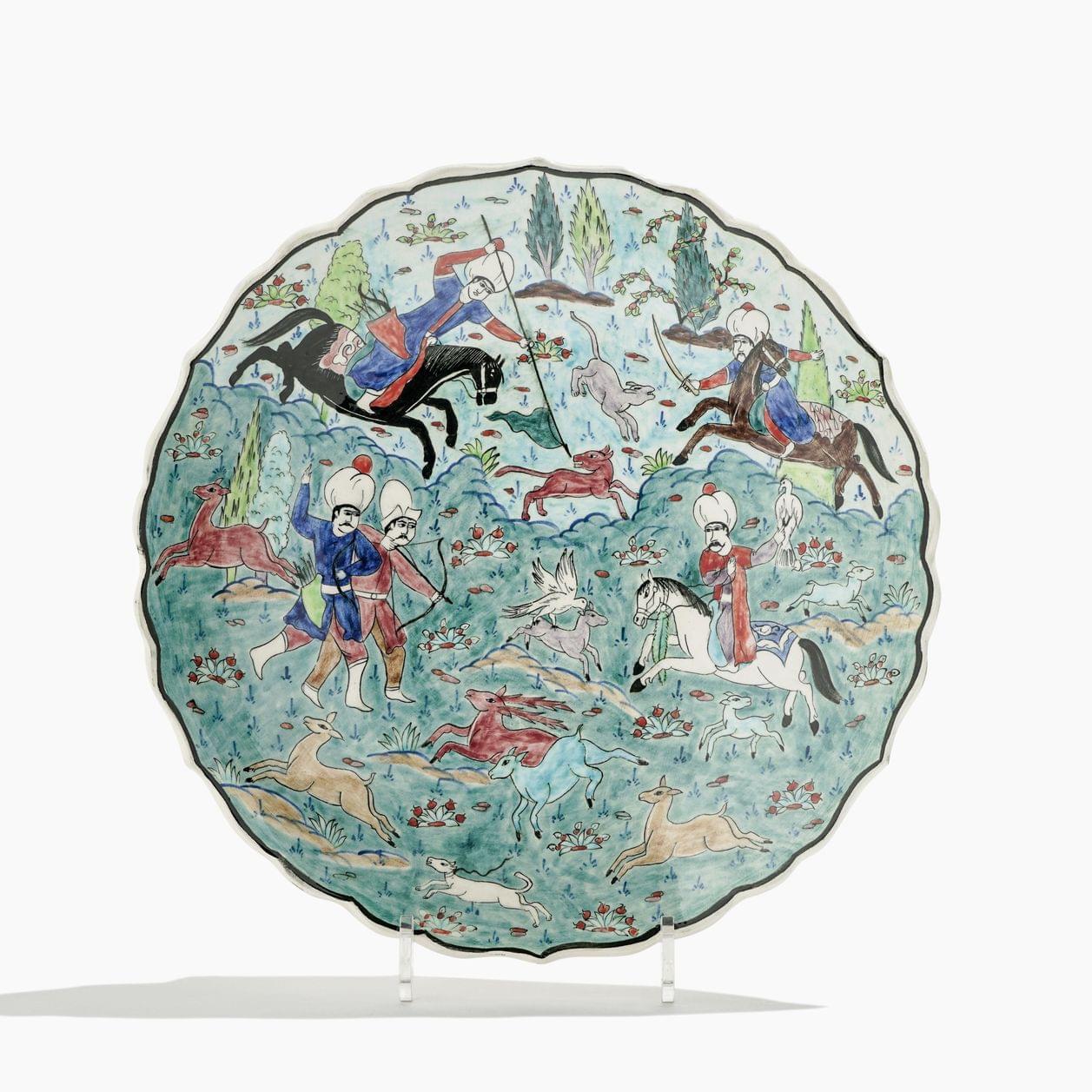 Céramique émaillée polychrome à décor d'une scène de chasse, D 32 cm