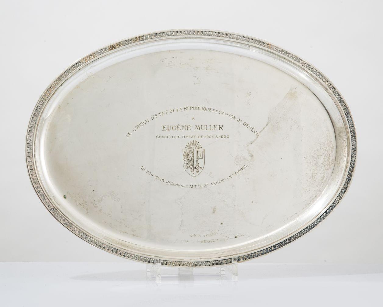3361. Plateau ovale à bordure de feuilles d'eau, dédicacé "Le Conseil d'Etat de la République et Canton de Genève à Eugène Muller chancelier d'Etat de 1928 à 1933, en souvenir reconnaissant de 35 années de service"