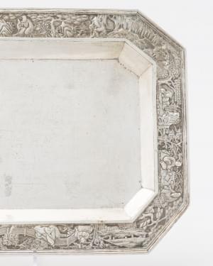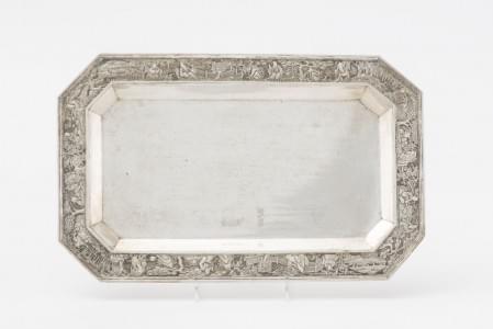 Métal argenté, prises en cuir noir, H 24 cm et L 27 cm