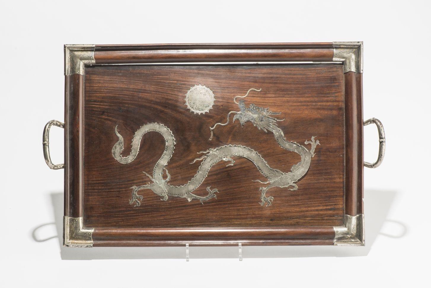 Acajou à décor incrusté d'argent ciselé figurant un dragon poursuivant la perle sacrée, 38x56 cm