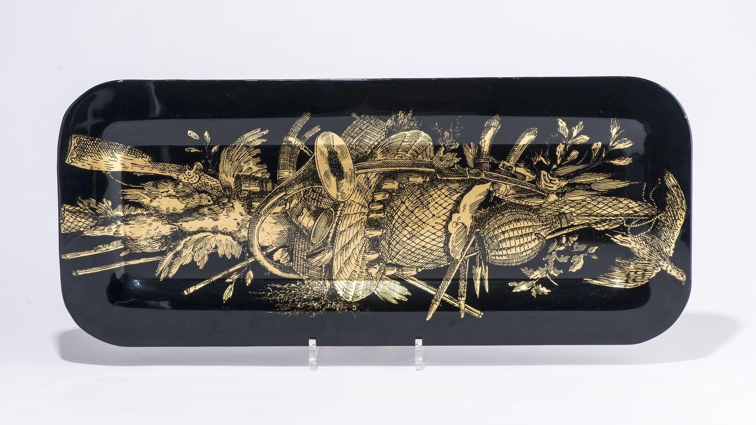 988. Plateau rectangulaire à motif de trophée doré sur fond noir