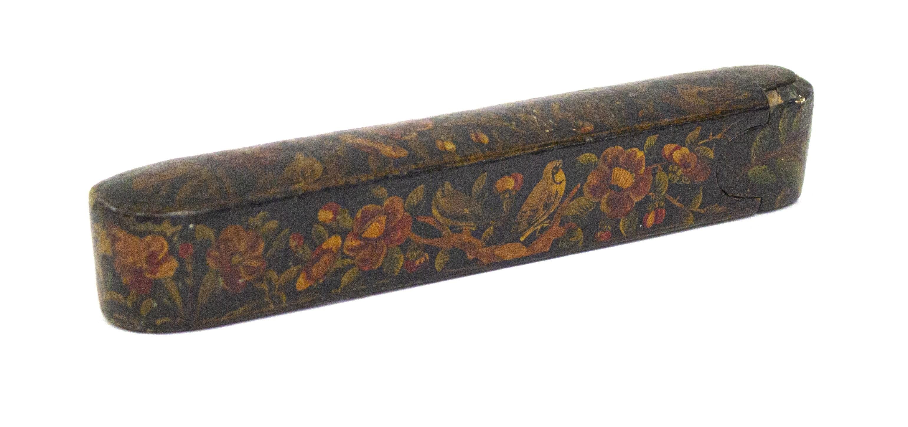 Carton bouilli peint à décor d'oiseaux et fleurs, L 22 cm