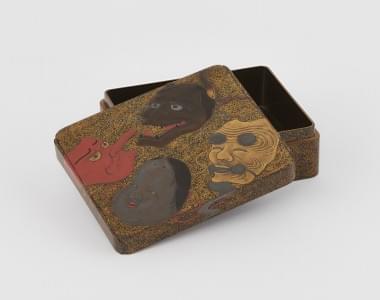 Laque polychrome et or à décor de masques du théâtre Nô, 4x12x10...