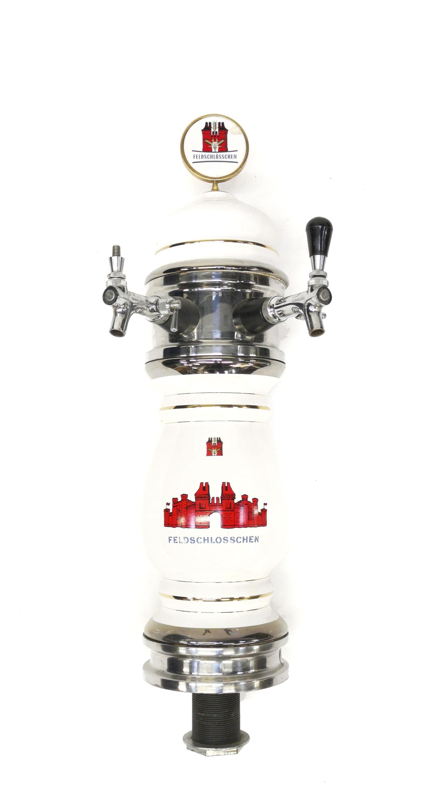 Deux robinets, métal et corps en porcelaine blanche, H 47 cm