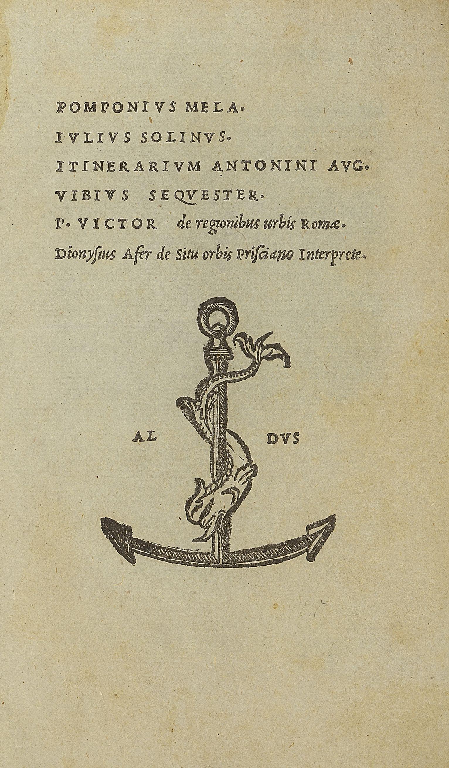 rbis Prisciano Interprete. Venise, Héritiers d’Alde Manuce et Andrea Torresano, 1518In 12, vélin post., pièces de titre et de tomaison en veau fauve et noir. Reliure ancienne. Bel exemplaire de cette unique édition aldine des œuvres de Pomponius Mela, l’un des grands géographes de l’Empire romain, sinon le premier. Les autres titres sont aussi en édition originale. Impression en italique, bien complète sur le titre et au verso du dernier feuillet, du fer caractéristique de l’atelier des Alde, au dauphin et à l’ancre.