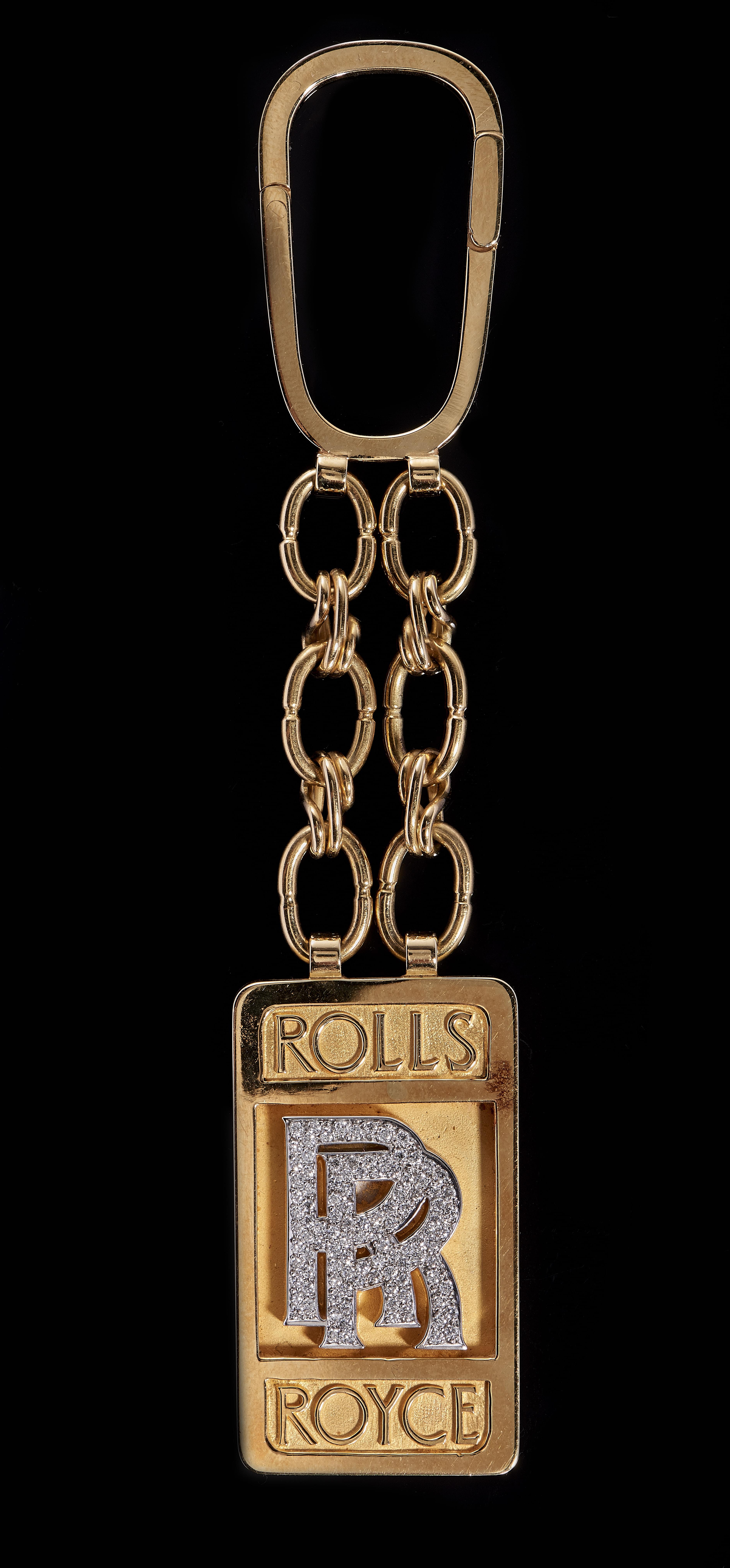 238. Porte-clé mousqueton retenant le logo Rolls Royce à deux tons d'or et aux initiales pavées de diamants