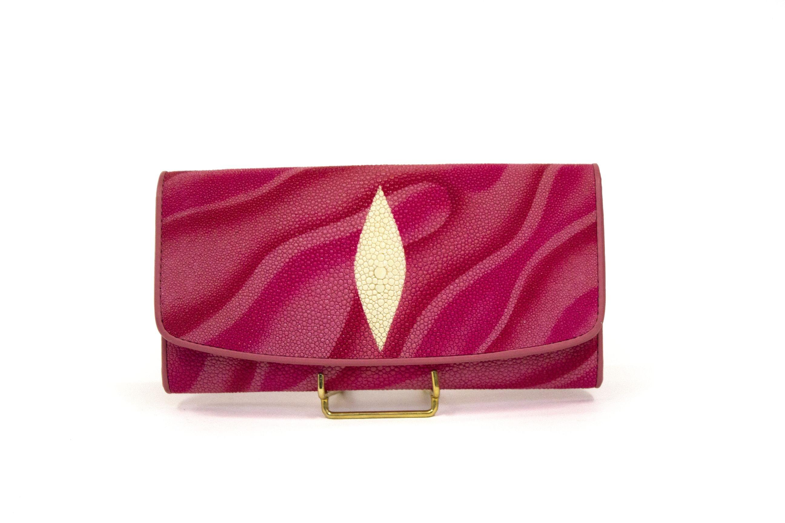 Galuchat rose centré d'un motif blanc, intérieur en tissu beige, 9x19 cm