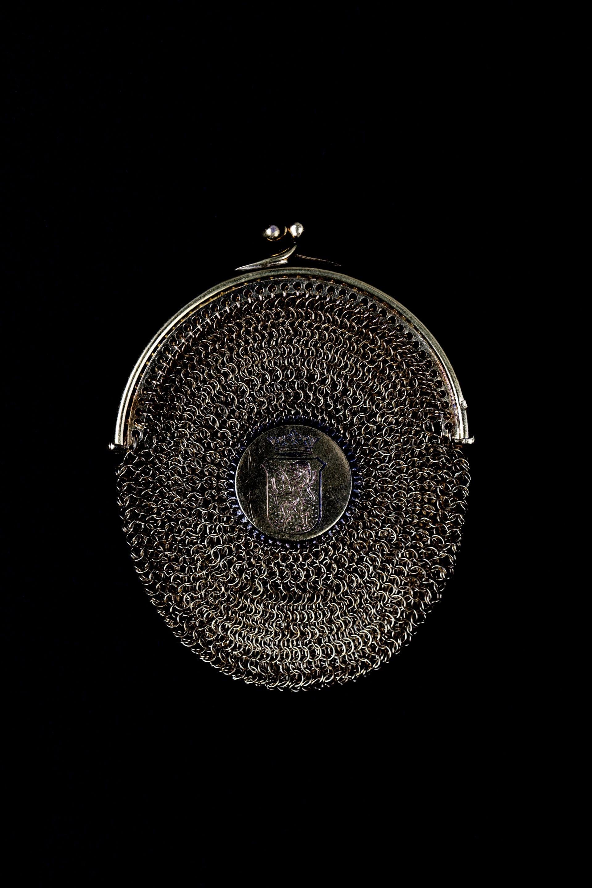 872. Porte-monnaie souple gravé d'armoiries à motif de lion surmontées d'une couronne