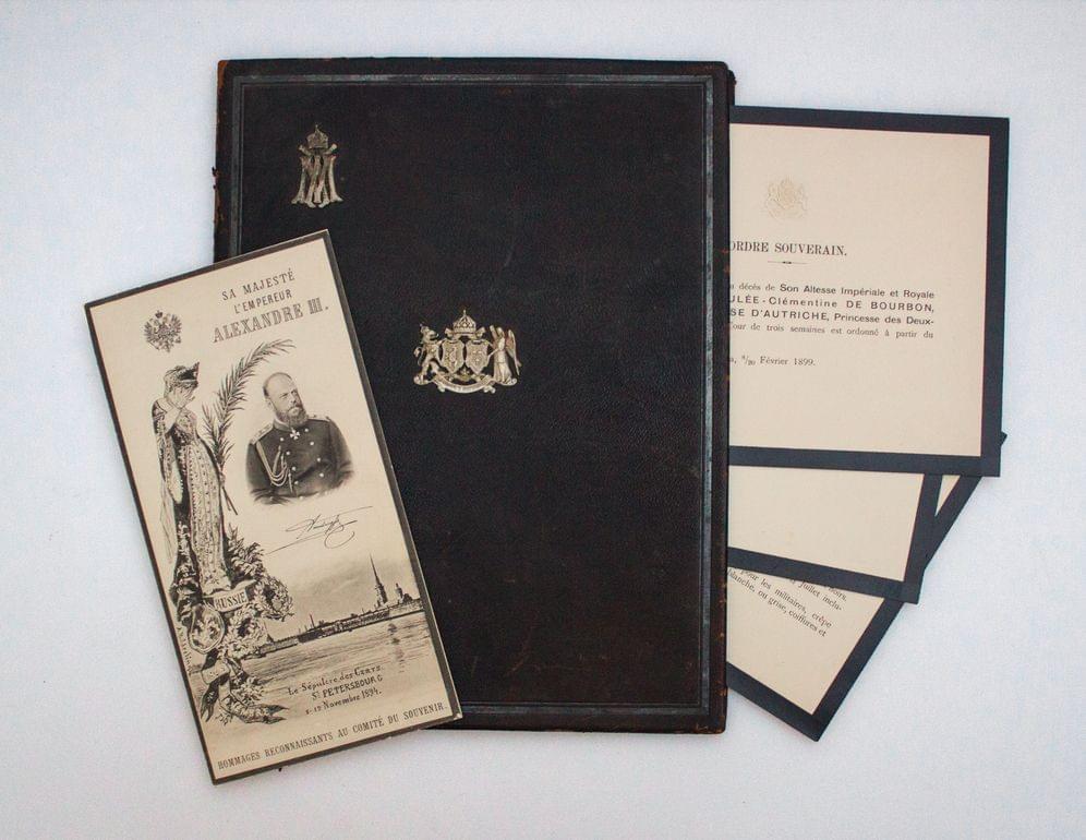 contenant l'ordre souverain de deuil au palais de Sophia à l'occasion du décès à 29 ans de son altesse royale la princesse en 1899, mais aussi celui, la même année, d'Alfred, Prince de Grande-Bretagne et d'Irlande, Duc de Saxe, Prince héritier de Saxe-Cobourg et Gotha qui se donne la mort à 24 ans, celui de Marie-Immaculée de Bourbon, archiduchesse d'Autriche et enfin une carte illustrée de Saint-Pétersbourg, d'une allégorie de la Russie et le portrait de Sa Majesté l'Empereur Alexandre III, "Hommages reconnaissants au comité du souvenir"