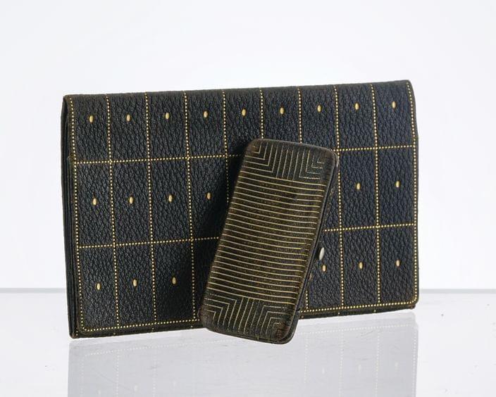 1098. Portefeuille en cuir noir à décor or, modèle de Josef Hoffmann (1870-1956) exécuté par les Wiener Werkstätte (1903-1932), signé à l'intérieur, vers 1915, 10,7 x 17 cm