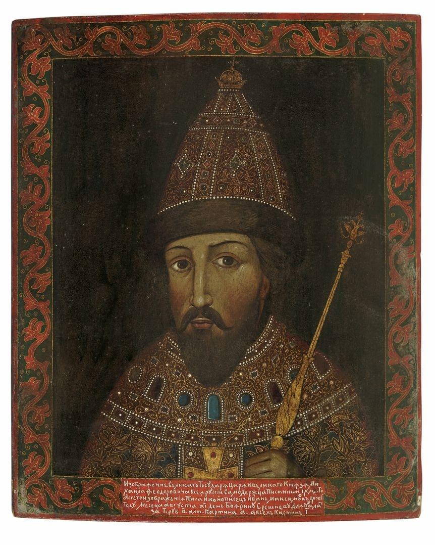 Icône russe, XVIIe s, portant l'inscription "Image du grand souverain, le tsar et grand-duc Michel Féodorovitch, autocrate de toute la Russie, peint en 1644. Cette image a été peinte par le peintre d’icônes Ivan Maksimoff en 1672, le 11 août, pour le boyard Steshneff [Streshneff], pour ses salles, pour 10 roubles et de 2 altines le tableau et il y a 10 tableaux en tout", Russie, XVIIe s, exemplaire réalisé pour un parent du tsar par son épouse née Eudoxie Streshneff (1608-1645), tempera sur panneau, 46x37 cm