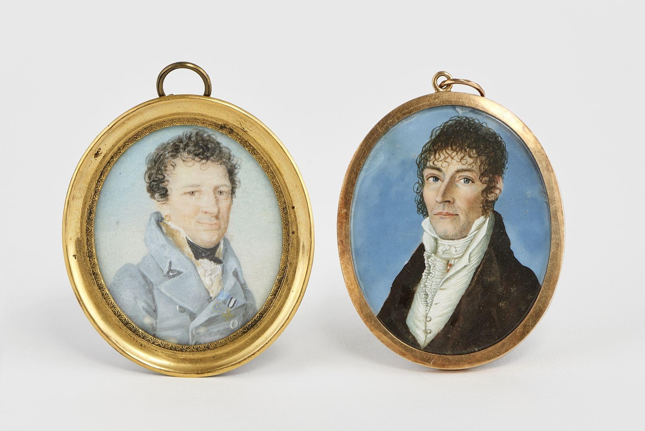 Deux miniatures, gouache sur ivoire, H 8 et 15 cm. Provenance: c...