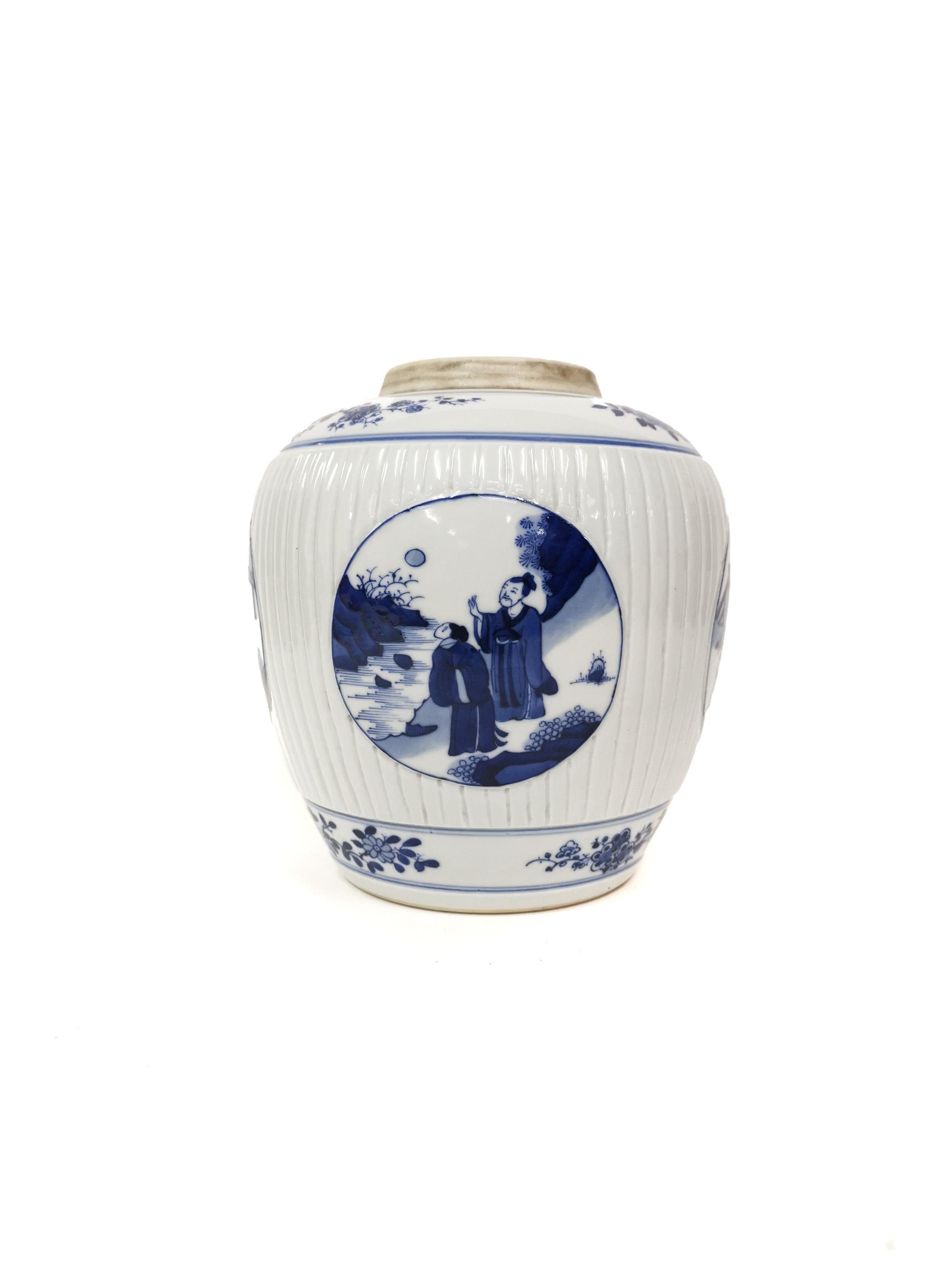 Porcelaine bleu blanc à motifs de scènes animées en réserves, H 21 cm