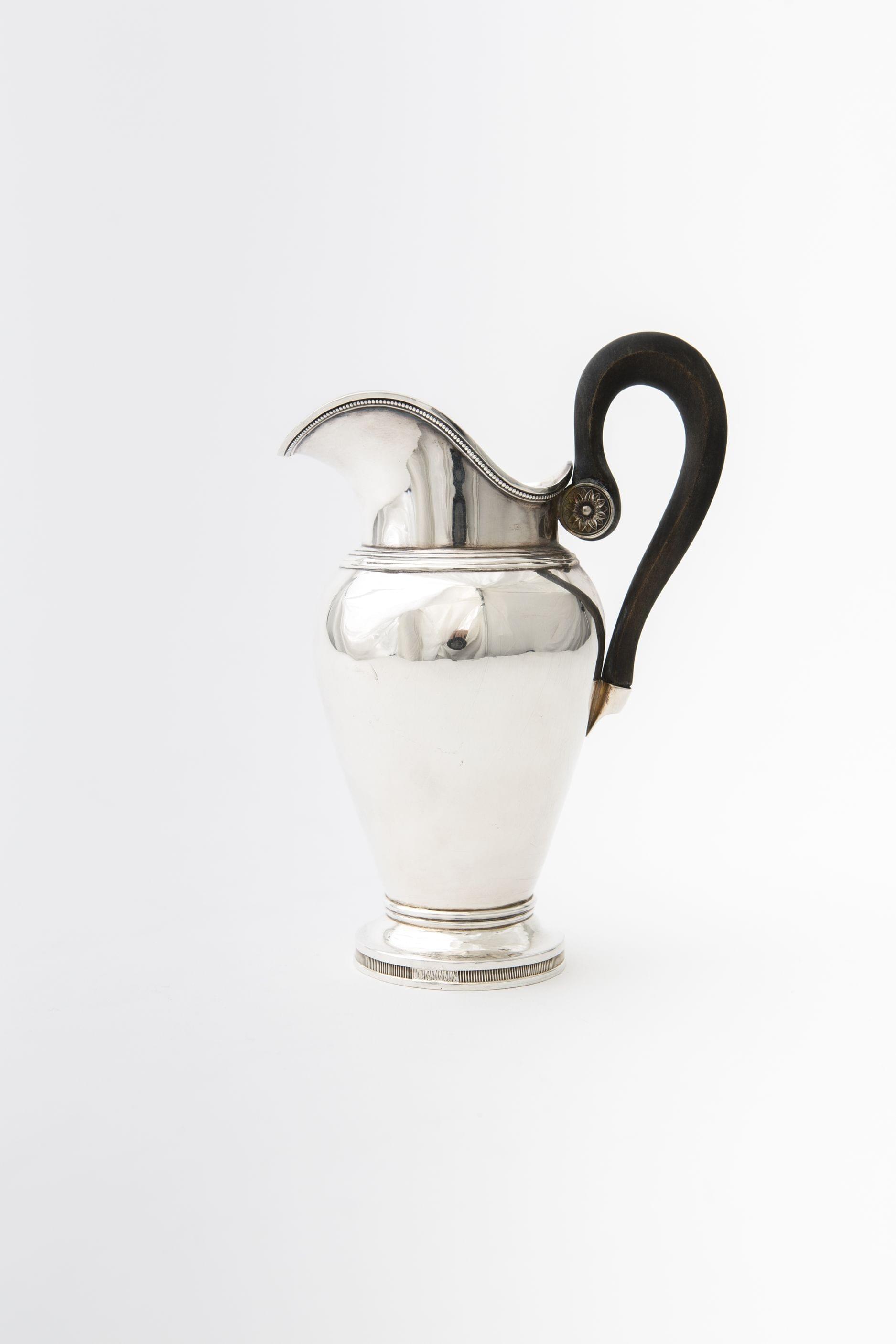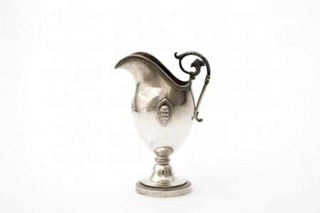 592. Crémier néoclassique à décor de mascarons en applique et anse ac...