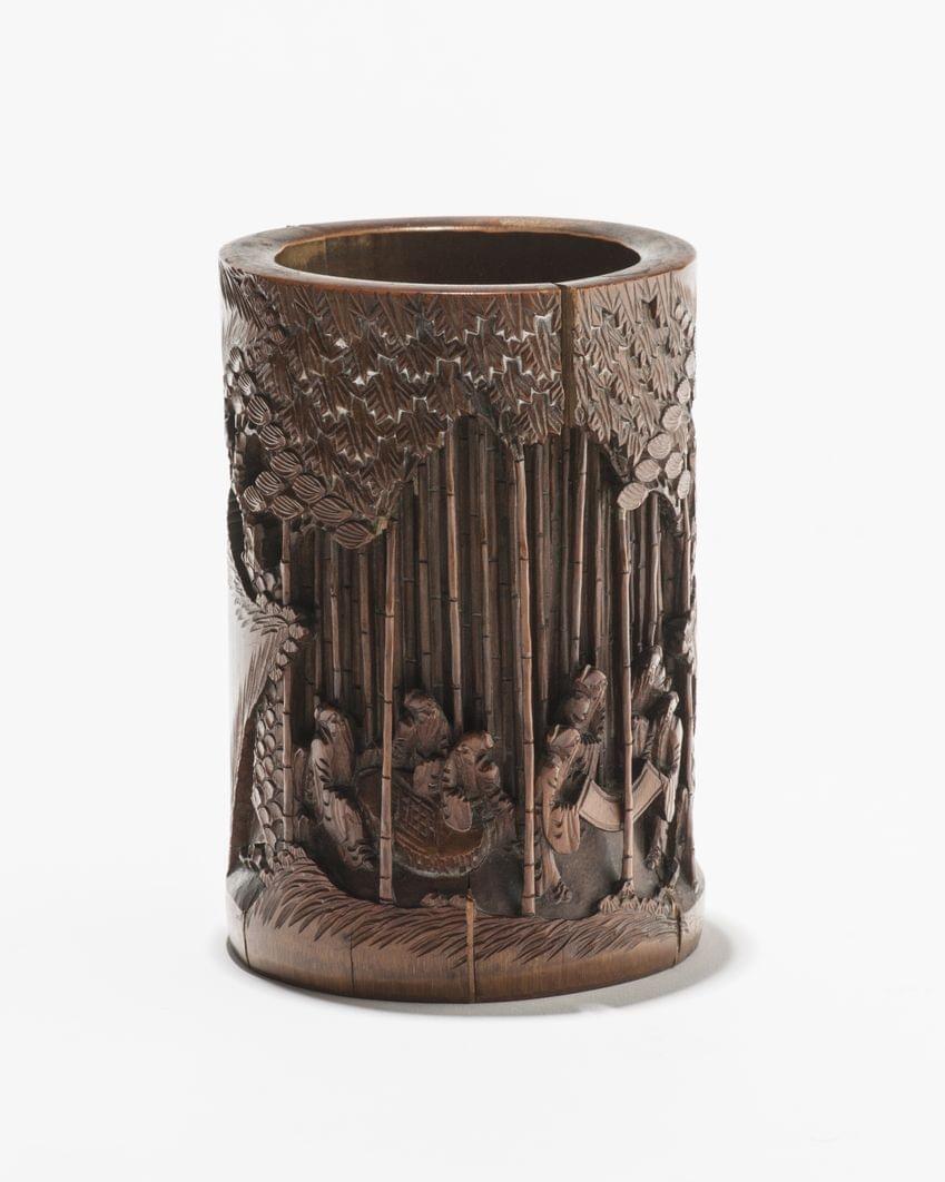 Bambou sculpté et ajouré à décor de personnages dans une bambouseraie, H 17cm , D 12 cm