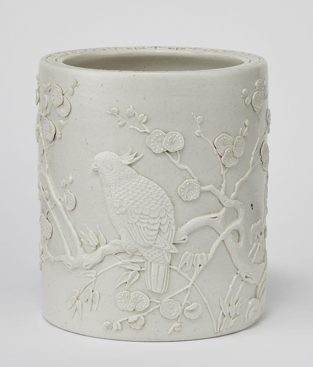 Porcelaine émaillée blanc à décor en relief d'un perroquet sur des branches de fleurs, H 14 cm