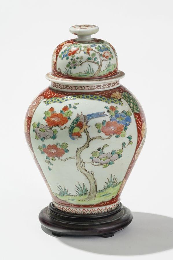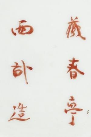Porcelaine à décor de réserves à motifs d'arbres, de fleurs et d'oiseaux sur fond rouge de fer, signée, H 30 cm