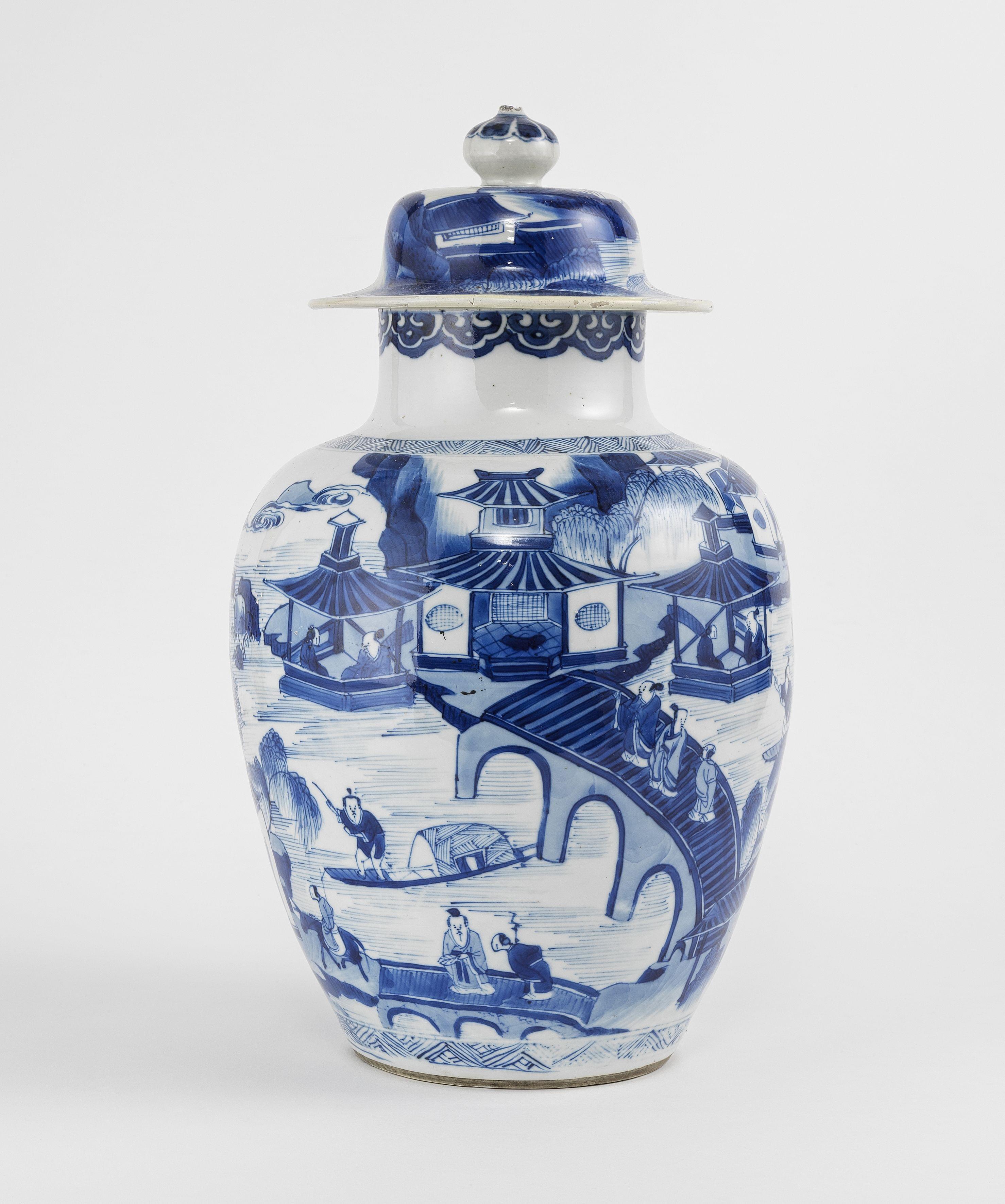 Porcelaine bleu blanc à motif de village de pêcheurs, H 44 cm