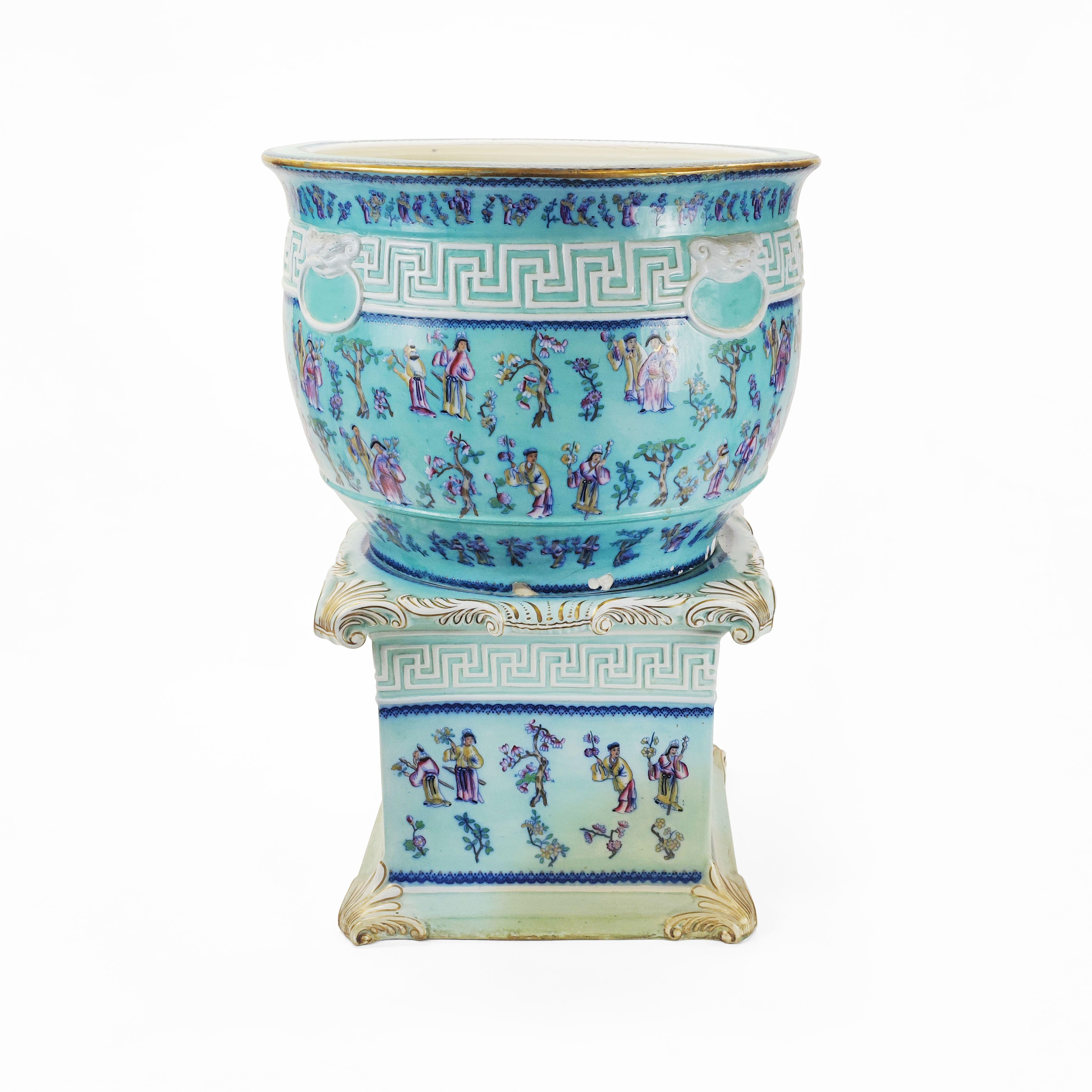 Porcelaine émaillée polychrome à décor imprimé de personnages et arbres sur fond céladon, H 77 cm, D 55 cm