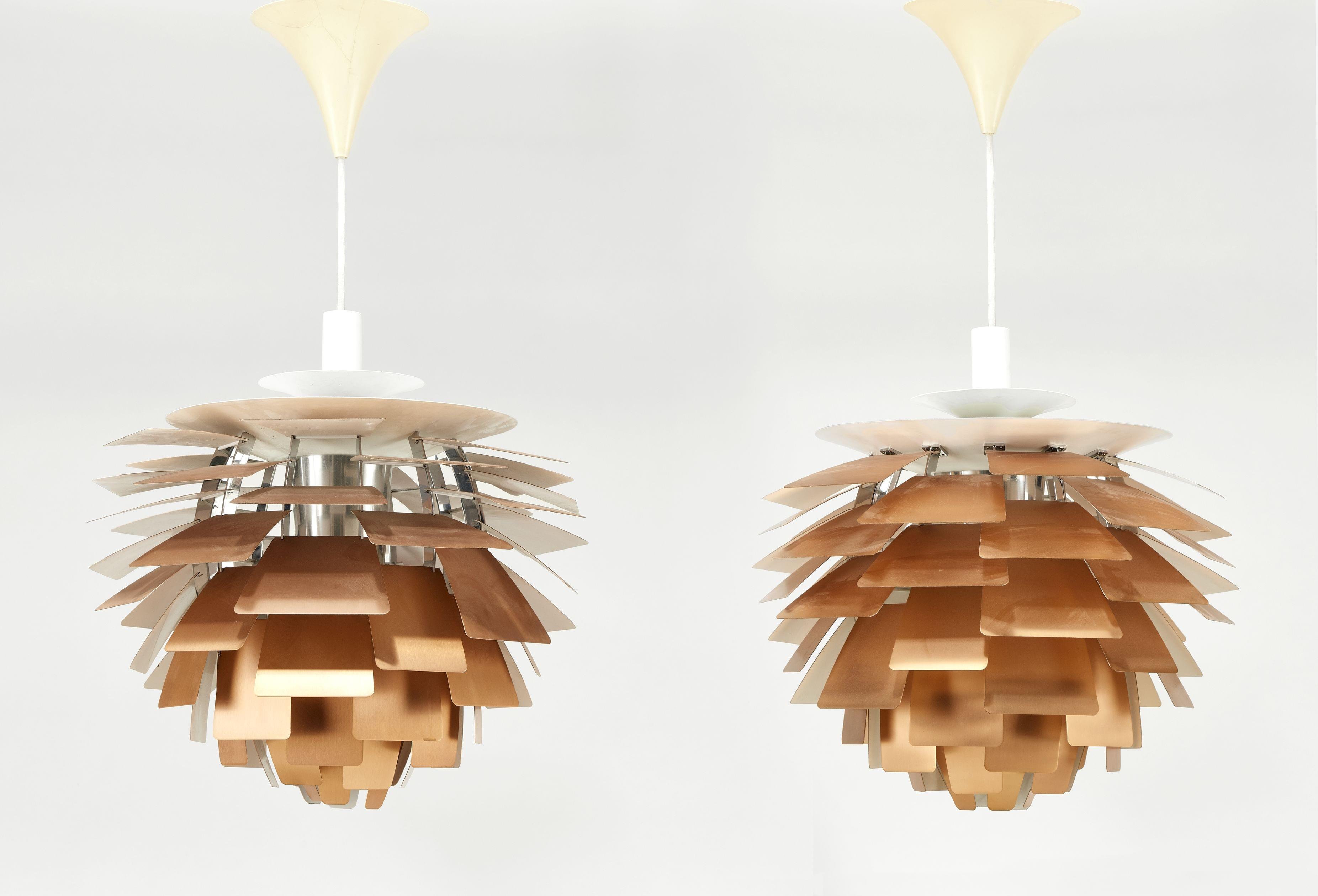 Paire de suspensions Artichaut, acier cuivré et laqué blanc, édition Louis Poulsen, circa 1960/70, (modèle créé en 1958), D 60 cm