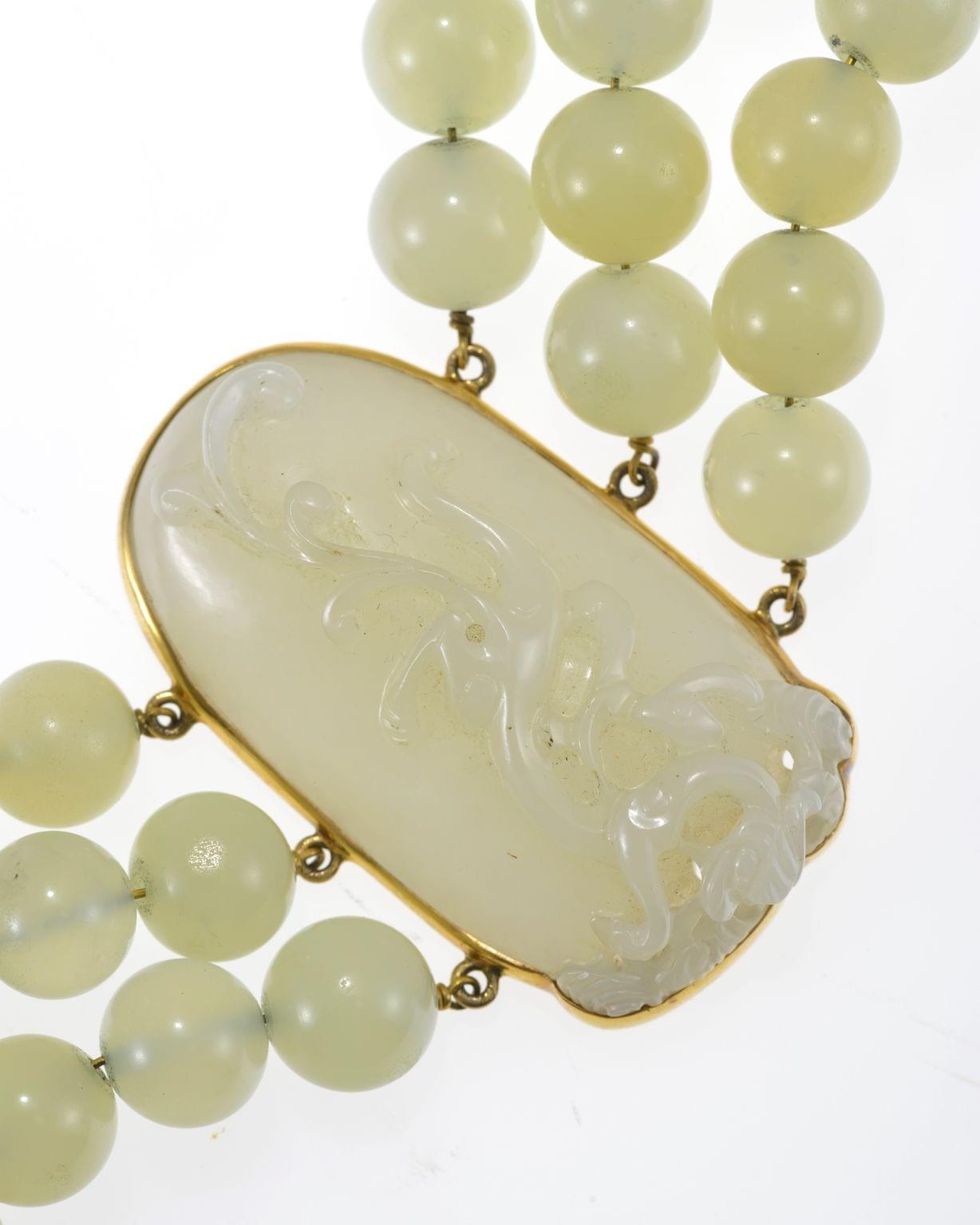608. POUR SEPTEMBRE Bracelet 3 rangs de perles avec médaillon central sculpté d'un dragon
